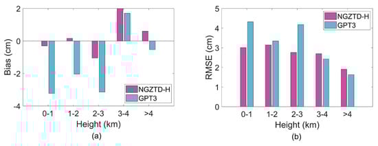 Because the vertical adjustment of the ZTD is related to elevation, the radiosonde stations over China were divided into five intervals to validate the effectiveness of the NGZTD-H model at different elevations. Figure 9 shows the bias and RMSE statistics in each interval for the NGZTD-H and GPT3 models. The GPT3 model exhibited a larger positive bias in the interval of 3–4 km and a larger negative bias in the intervals of 0–3 and >4 km. The bias of the NGZTD-H model was smaller in each interval. A larger positive bias occurred in the interval of 3–4 km, indicating that the NGZTD-H model had a larger value than the reference value in this interval. Furthermore, the RMSE of the GPT3 model was larger in the intervals of 0–1 and 2–3 km. The above analysis shows the NGZTD-H model exhibited more stable performances in vertical adjustment for ZTD over China.