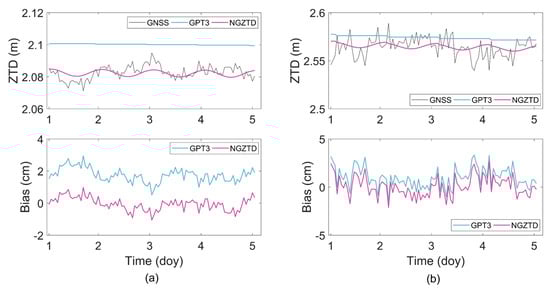 The ZTD from GNSS stations can reach an accuracy of 4 mm [43]. It is recognized as a truth value and is widely used to evaluate the ZTD derived from other data and ZTD models [44]. GNSS-derived ZTD was used as reference value to validate the accuracy of the NGZTD model. It can be used to validate the NGZTD model’s ability to capture diurnal variations of ZTD, as the temporal resolution of GNSS data is 1 h.