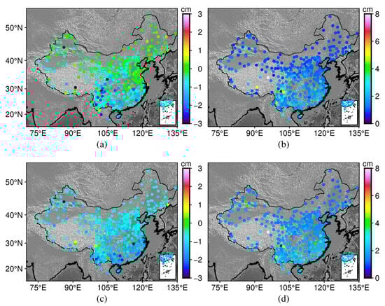 Distribution of spatial interpolation accuracy for NGZTD-H and GPT3 models using the GNSS-derived ZTD at GNSS stations in 2018. (a) The bias of NGZTD-H. (b) The RMSE of NGZTD-H. (c) The bias of GPT3. (d) The RMSE of GPT3.