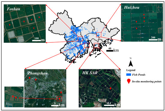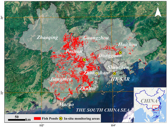 The total number of ponds was difficult to obtain, as the individual fish ponds may only occupy 1–2 pixels and connect with each other (Figure 7). In our previous study [5], fish ponds throughout the GBA were obtained (Figure 7), which were used to mask the investigation results. Due to the spatial resolution of Landsat imagery (30 m × 30 m), problems may happen to some extremely narrow ponds with an area less than 900 m2. Liu’s study in 2022 [45], taking Foshan as an example, used GF-1 satellite images to extract the area of fish ponds, indicating that the area of fish ponds ranges between 1000 and 3600 m2. Thus, we can identify almost all fish ponds using Landsat8/9, which can meet the needs of this study; the small discrepancy caused by misidentification should be negligible.