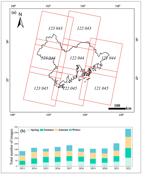 Image selection and image availability for this study: (a) the strip number of the images covering the GBA, (b) the number of available images from Landsat8/9 for this study.