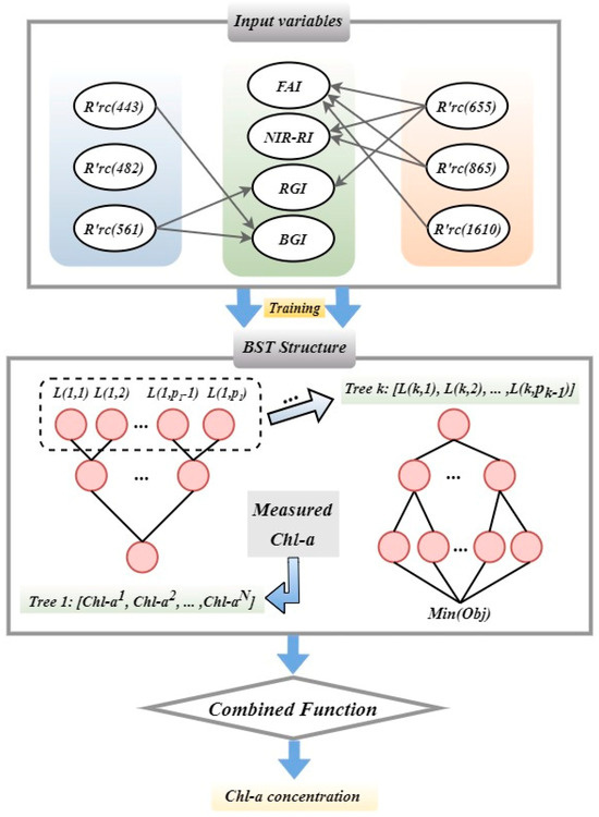 This BST model utilized Rayleigh-corrected OLI data for Chl-a estimation. Additionally, the floating-algae-index (FAI) was also considered as a crucial input parameter. FAI plays an important role in monitoring and assessing algae and other aquatic organisms that can cause changes in Chl-a concentration [30]. It is defined as a composite algorithm between the RED (655 nm), NIR (865 nm), and SWIR (1610 nm) bands. Compared with normalized vegetation indices (NDVI) and enhanced vegetation indices (EVI), FAI has lower requirements in image quality. The FAI can be computed using the RED, NIR, and SWIR channels of the OLI sensor. The calculation is as follows: