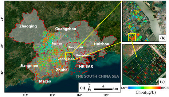 Chlorophyll-a (Chl-a) is a crucial photosynthetic pigment produced by algae during photosynthesis, making it an effective indicator for monitoring water eutrophication [13]. In recent years, factors such as climate change [14] and excessive aquaculture activities resulting from human activities [15,16,17] have led to elevated eutrophication [18,19,20]. Consequently, there has been a proliferation of algae in inland water bodies, leading to an increase in Chl-a concentration [21,22]. Hence, continuous monitoring of Chl-a concentration in fish ponds in the GBA and studies of water eutrophication are vital for comprehending the current ecological conditions of Chinese aquaculture ponds. Additionally, such studies help evaluate the impact of aquaculture management practices on pond environments, and aid in the development of effective remediation strategies.