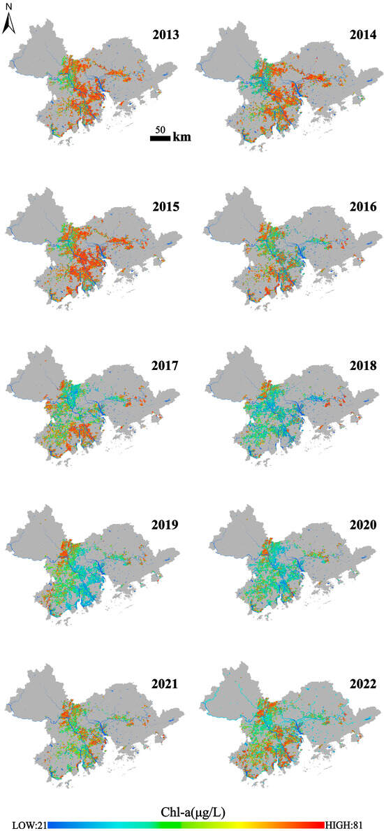 Annual average Chl-a concentration changes in fish ponds in the GBA from 2013 to 2022.