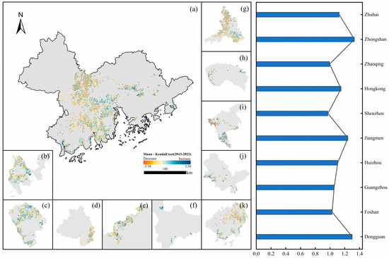 MK trend test results for Chl-a concentration changes in fish ponds in the GBA from 2013 to 2022 ((a): overall test result, (b): Zhuhai, (c): Zhongshan, (d): Zhaoqing, (e): Hong Kong, (f): Shenzhen, (g): Foshan, (h): Dongguan, (i): Guangzhou, (j): Huizhou, (k): Jiangmen).
