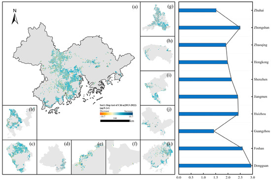 Sen’s test results for Chl-a concentration change in fish ponds in the GBA from 2013 to 2022 ((a): overall test result, (b): Zhuhai, (c): Zhongshan, (d): Zhaoqing, (e): Hong Kong, (f): Shenzhen, (g): Foshan, (h): Dongguan, (i): Guangzhou, (j): Huizhou, (k): Jiangmen).