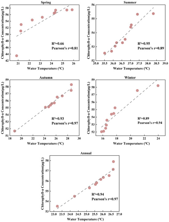 Figure 16 shows the correlation between Chl-a concentration and water temperature across various time scales, each point representing a year from 2013 to 2022. The result shows the robust positive relationship between water temperature and Chl-a concentration (R2 > 0.65), with correlation being strongest in summer (R2 = 0.95), reaching 0.94 annually. The relationship between chlorophyll-a (Chl-a) concentration and temperature is typically positive. As temperature increases, the growth rate of phytoplankton often accelerates, leading to higher Chl-a concentrations. Warmer temperatures can enhance photosynthetic activity and nutrient uptake by phytoplankton, promoting their proliferation. However, this relationship can be influenced by other factors such as nutrient availability, light conditions, and water mixing patterns [51,52,53,54]. Except during algal bloom events when Chl-a concentration and water temperature exhibit significant disparities, a consistent strong correlation between the two variables persists under other scenarios. Therefore, we posit those seasonal changes in Chl-a concentration in fish ponds primarily stem from shifts in water temperature.