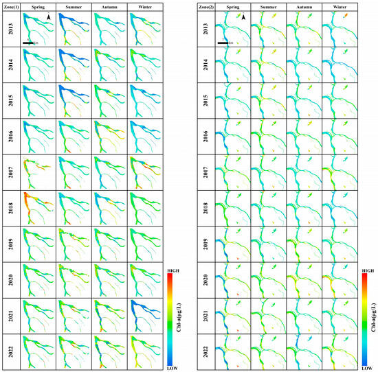 Chl-a concentration variations of riverine Zone (1) and Zone (2) in different seasons from 2013 to 2022.