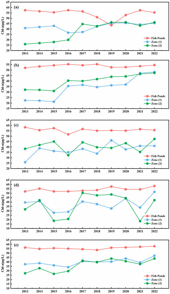 Comparison of Chl-a concentration change between riverine Zone (1) and Zone (2) and fish ponds (referring to fish ponds in the entire GBA) in different seasons in the past decade: (a) Spring; (b) Summer; (c) Autumn; (d) Winter; (e) Annual.