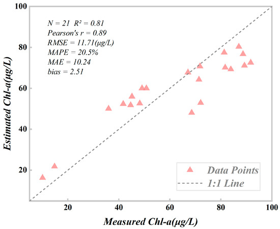 Accuracy verification involved 21 measured data points for Chl-a concentration. Concurrently, 3 × 3 pixel window averages were employed to extract Chl-a concentration at corresponding locations from the retrieval results. As depicted in Figure 20, both the estimated values and the measured values fall within the range of 10–100 μg L−1. Notably, there exists a high correlation between the estimated and measured values, suggesting that the BST model demonstrates favorable retrieval performance for the provided test data (R2 = 0.81, RMSE = 11.71 μg L−1, MAPE = 20.5%, MAE = 10.24, bias = 2.51). These results underscore the efficacy of the BST model in Chl-a retrieval for fish ponds in the GBA. It is worth noting that the estimated values slightly surpass the actual measured values, possibly due to the absence of high Chl-a concentration values in the training dataset, potentially resulting in the underestimation of high Chl-a concentration. Given the scarcity of high-quality in-situ observations with specific time and location for fish ponds in the GBA, the model’s applicability and accuracy may be constrained. In forthcoming studies, we aim to gather more high-quality samples to establish a more precise and robust model. Overall, the study’s findings validate the BST model’s effectiveness in Chl-a retrieval in the GBA.