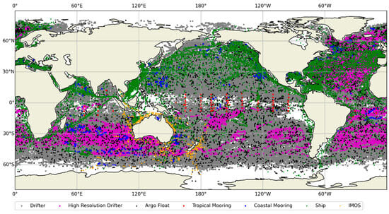SSTs collected from MWRI, AMSR2, and iQuam span from 30 April 2019 to 31 December 2023. Initially, spatiotemporal matching is performed between MWRI SST and iQuam SST, followed by matching the results with AMSR2 SST to create triple-collocations. During the matching process, the spatial distance constraint between observations is set at 25 km, and the time difference limit is 30 min. Considering the differences in the performance of in situ measuring platforms and buoy types, the collocations are stratified into ships, drifters, T-M, C-M, Argo, HR-D, and IMOS. Figure 1 exhibits the spatial distribution of the collocations. To avoid interference from diurnal variations in SST during intercomparison, the collocations are divided into daytime and nighttime groups. Table 3 lists the number of collocations.