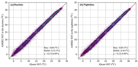 Comparison between AMSR2 SST and iQuam SST in the daytime and nighttime. (a) Daytime. (b) Nighttime.