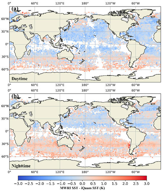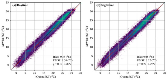 Comparison between MWRI SST and iQuam SST in the daytime and nighttime. (a) Daytime. (b) Nighttime.