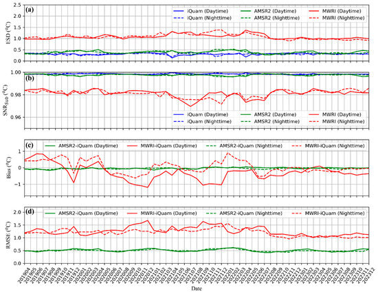 Compared to iQuam SST, the bias in AMSR2 SST shows slight fluctuations around 0 °C, while the RMSE remains close to 0.5 °C. In contrast, both the bias and RMSE of MWRI SST exhibit larger and less regular fluctuations. From April 2019 to July 2022, the biases of MWRI SST during daytime and nighttime vary between −0.6 °C and 0.9 °C and between −1.25 °C and 0.8 °C, respectively. Similarly, the RMSE of MWRI SST during daytime and nighttime fluctuates between 1.1 °C and 1.6 °C and between 1.1 °C and 1.7 °C, respectively, over the same period. Since July 2022, the biases of MWRI SST during both daytime and nighttime have been constrained within the range of −0.5 °C to 0.25 °C, with the RMSE reduced to below 1.2 °C. Considering the variations in ESD, , bias and RMSE, it can be concluded that the performance of MWRI has improved following the resolution of sensor calibration or data processing issues since July 2022.