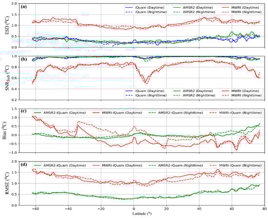 As illustrated in Figure 7c, the bias of AMSR2 SST compared with iQuam SST ranges between −0.2 °C and 0.2 °C in the latitude range of 62°S to 50°N. Beyond 50°N, the bias of AMSR2 SST increases with latitude, peaking at 0.65 °C around 77°N. The RMSE of AMSR2 SST varies between 0.5 °C and 0.6 °C in the latitude range of 62°S to 35°S, decreasing to below 0.5 °C in the latitude range of 35°S to 35°N. From 35°N to 77°N, the RMSE of AMSR2 SST monotonically increases with latitude, reaching a maximum of 0.95 °C. The bias of MWRI SST compared with iQuam SST exhibits irregular fluctuations ranging from −0.8 °C to 1.1 °C, with the maximum occurring around 62°S. During daytime, MWRI SST shows warm biases for latitudes greater than 40°S in the Southern Hemisphere and negative biases in the latitude range of 26°S to 72°N. Conversely, during nighttime, the curve of the bias of MWRI SST mostly lies above the zero-bias line from 62°S to 7°N, indicating a warm bias across most of the Southern Hemisphere. However, from 7°N to 72°N, the curve of the bias of MWRI SST during nighttime mostly lies below the zero-bias line, indicating a negative bias across most of the Northern Hemisphere. This corresponds to the findings depicted in Figure 5. The RMSE of MWRI SST increases with latitude, exhibiting a minimum value of about 0.92 °C around 6°N and a maximum value of about 1.67 °C around 62°N. For MWRI, both the bias and the RMSE show significant jumps around 35°S, 0°, 18°N, and 52°N.