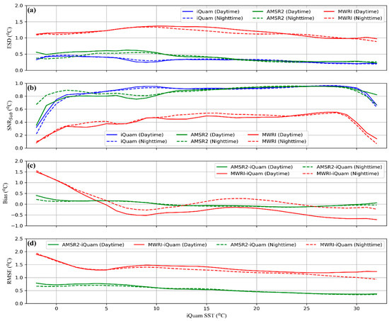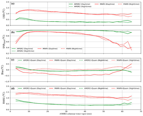 The ESD of MWRI increases with columnar water vapor when it is less than 8 mm, and decreases when it exceeds 8 mm. The of MWRI follows a similar trend as the ESD with columnar water vapor, peaking at 14 mm. Relative to iQuam SST, MWRI SST during the daytime exhibits a negative bias except for columnar water vapor less than 7 mm or greater than 59 mm, while nighttime bias is positive. The RMSE of MWRI SST decreases with columnar water vapor when it is less than 58 mm. However, in nighttime conditions, it tends to increase when columnar water vapor exceeds 58 mm. Furthermore, the RMSE of MWRI SST is lower during nighttime than during daytime, indicating higher accuracy at night.