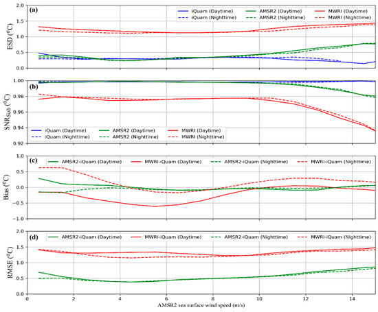 The ESD of AMSR and MWRI exhibits a similar relationship with sea surface wind speed. Fluctuations are minimal when the sea surface wind speed is less than 9 m/s. However, when the wind speed exceeds 9 m/s, the ESD increases with increasing sea surface wind speed. Furthermore, the ESD of AMSR2 and MWRI is higher during the daytime than at nighttime. The of AMSR2 and MWRI tends to decrease when the wind speed exceeds 9 m/s, with daytime values being lower than nighttime values. This suggests that the performance of AMSR2 and MWRI during the daytime is inferior to that during the nighttime. In contrast to AMSR2 and MWRI, the iQuam ESD decreases with increasing wind speed when it exceeds 9 m/s. This occurs because the mixing of seawater at high wind speeds reduces the difference between the subsurface temperature and the skin temperature, thereby making the iQuam SST closer to the true SST value.