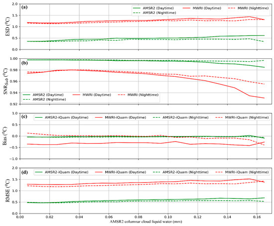 With increasing columnar liquid water, the ESD of AMSR2 and MWRI tends to increase, while the tends to decrease. The ESD during nighttime is consistently lower than during the day, while the during nighttime is higher than that during the daytime. These differences become more pronounced with higher levels of columnar liquid water. The bias of AMSR2 SST relative to iQuam SST shows no obvious change with columnar liquid water, but the RMSE increases with increasing levels of columnar liquid water. The bias of MWRI SST during the daytime is consistently negative, with a mean value of −0.35 °C. However, during the nighttime, it ranges from −0.4 °C to 0.15 °C, with positive bias when columnar cloud liquid water is less than 0.1 mm and negative bias when it exceeds 0.1 mm. The lower ESD, higher , and smaller RMSE during nighttime compared to daytime indicate that both AMSR2 and MWRI perform better at night.