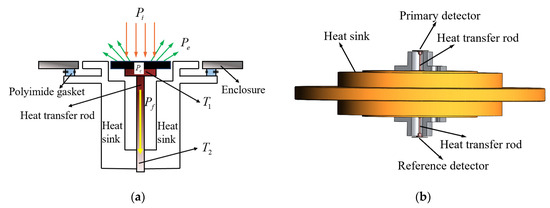 The IEMROS non-scanning radiometer’s pivotal element is the bolometric detector module, which operates based on thermal radiation and conduction principles. The technological basis of such a module has been validated by its application in the spaceborne relative radiometer onboard the Fengyun-3F satellite [27]. Figure 3a,b shows the detector module’s schematic diagram and mechanical model. There are four major components: the primary detector, the reference detector, the heat sink, and the heat transfer rod. The primary and reference detectors are mounted on separate thermally coupled disks. These detectors are connected to the heat sink, maintained at a constant temperature, and secured to the enclosure with a polyimide gasket for mechanical stability and thermal isolation. The detectors are coated with Nextel Velvet Coating 811-21, which absorbs the radiation from the target and converts it to heat, resulting in a detectable change in the temperature of the primary detector. The relationship between the detector temperature and the incident radiation is quantified and described by Equation (1), which characterizes the response model of the detector and delineates how changes in radiation levels are translated into temperature changes.