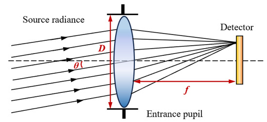 where is the uniform radiance entering the optical system, is the diameter of the entrance pupil, is the angle between the incident radiation and the telescope’s principal axis, is the total transmittance of the optical system, and is the radiation solid angle corresponding to the detector receiving area .