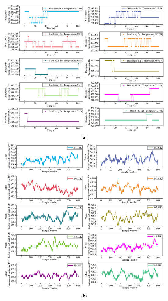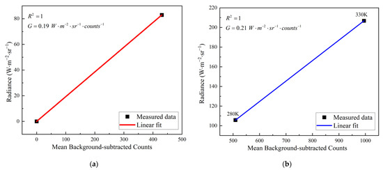 According to the working principle of the detector described in Section 2.1, the radiant flux received by the primary detector is proportional to the measured temperature difference. Consequently, this proportionality is mathematically expressed through a linear equation, which converts the source radiance into background-subtracted DN counts, as detailed in Equation (9).