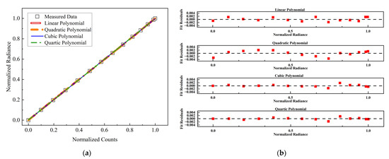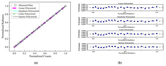 Least-squares regression analyses are performed on the normalized radiance and background-subtracted counts for both the SW and TW channels, including a comparative examination of linear, quadratic, cubic, and quartic polynomial regressions. The plots in Figure 8a,b and Figure 9a,b show the results of these fits and the corresponding residual distributions for the SW and TW channels, respectively. These visual representations demonstrate minor discrepancies between linear and higher-order polynomial models. The R2 is very close to unity when using the linear fit.