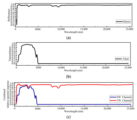 Despite the radiometric calibration efforts, we also conducted component-level relative spectral response tests to ascertain the level of out-of-band radiation leakage. Figure 11 displays the filter’s transmittance, the mirrors’ reflectivity, and the combined relative spectral response of the radiometer across the wavelength range of 0.25 to 25.1 μm. The data demonstrate that the SW channel effectively blocks radiation in the 5.0–25.1 μm range. While the filter’s transmittance properties beyond 25.1–50.0 μm remain indeterminate, the Earth’s RSR within this spectral domain is markedly weak, making its influence on the measurement results negligible. The test results confirm that the non-scanning radiometer has reliable radiation collection capabilities within the requisite bandwidth.