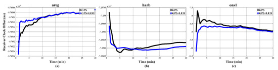 - The receiver clock offset calculated using the LEO-augmented PPP model demonstrated accelerated convergence. The receiver clock offsets for three representative stations—areg, harb, and ons1—were examined. The convergence velocity of the receiver clock offsets was contrasted with those derived solely from GPS data. The convergence speed post-LEO augmentation was enhanced, with varying degrees of enhancement observed across different links. A convergence confidence interval was established to determine convergence time. The results showed that harb’s cesium clock had the greatest increase in convergence speed at 65.0%. ons1’s hydrogen clock had an increase of 50.0%, while areg’s rubidium clock had the slowest increase at 18.8%. Therefore, LEO-augmented PPP affected clock offset convergence speeds differently on stations with different atomic clock frequency sources, reflecting the performance of the atomic clocks. The performance of atomic clocks directly determines the accuracy of time measurement, which in turn affects the measurement results of satellite signals and is indirectly reflected in the later data processing.