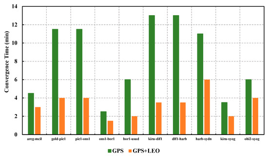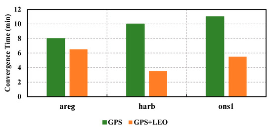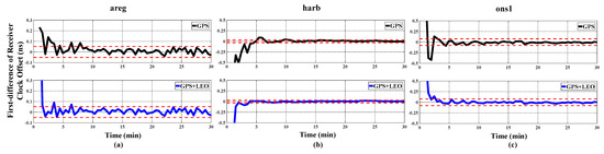 Three representative stations, namely areg, harb, and ons1, were selected to analyze the receiver clock offset calculated by LEO-augmented PPP. The three stations—areg, harb, and ons1—used rubidium, cesium, and hydrogen, respectively, as their clock frequencies. The first 30 min receiver clock offsets of the three stations are shown in Figure 3a–c, and the first-order difference results of the clock offsets are shown in Figure 4a–c. In the calculation, the three stations involved an average of eight low-orbit satellites. According to the clock offset variation diagram of the three stations, receiver clock offsets converge faster under LEO enhancement than under the sole GPS. To quantify the convergence time, by calculating the first-order difference of the receiver clock offset, the mean and standard deviation were calculated using the converged first-order difference data, and the convergence confidence interval was obtained by adding and subtracting the mean from two times the standard deviation. The convergence criterion was that the first-order difference result of the receiver clock offset should be within the range of the convergence confidence interval for 10 min. The red lines in Figure 4a–c represent the boundaries of the convergence confidence interval. The results of the statistical convergence time calculation are presented in Table 4 and Figure 5. According to the statistics, the convergence period was significantly shorter compared to processing sole GPS data and moreover significantly different at the three stations. The convergence speed increased the most (65.0%) at station harb, with its cesium clock; second-most (50.0%) at station ons1, with its hydrogen clock; and least (18.8%) at station areg, with its rubidium clock.