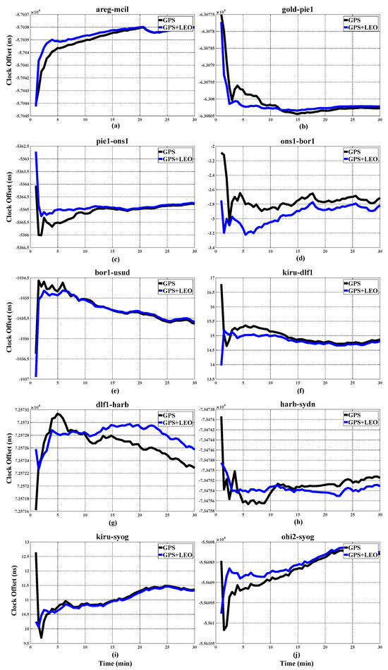 Time transfer link clock offset time series (black denotes GPS alone; blue GPS + LEOs). (a) The clock offset sequence of the areg-mcil time transfer link, (b) The clock offset sequence of the gold-pie1 time transfer link, (c) The clock offset sequence of the pie1-ons1 time transfer link, (d) The clock offset sequence of the ons1-bor1 time transfer link, (e) The clock offset sequence of the bor1-usud time transfer link, (f) The clock offset sequence of the kiru-dlf1 time transfer link, (g) The clock offset sequence of the dlf1-harb time transfer link, (h) The clock offset sequence of the harb-sydn time transfer link, (i) The clock offset sequence of the kiru-syog time transfer link, (j) The clock offset sequence of the ohi2-syog time transfer link.