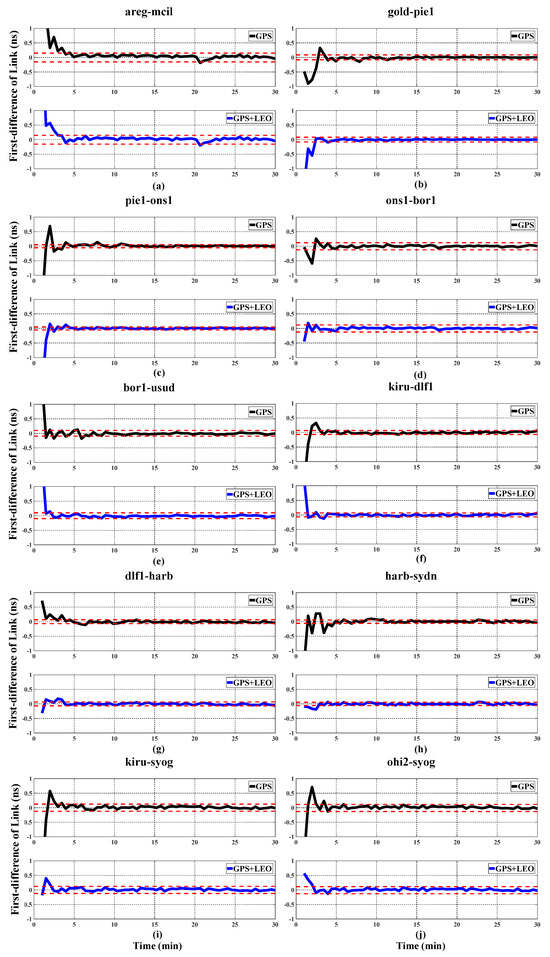 The first-order difference results of clock offsets time series in time transfer links (black denotes GPS alone; blue, GPS + LEOs). (a) The first-order difference results of the clock offset sequence for the areg-mcil time transfer link, (b) The first-order difference results of the clock offset sequence for the gold-pie1 time transfer link, (c) The first-order difference results of the clock offset sequence for the pie1-ons1 time transfer link, (d) The first-order difference results of the clock offset sequence for the ons1-bor1 time transfer link, (e) The first-order difference results of the clock offset sequence for the bor1-usud time transfer link, (f) The first-order difference results of the clock offset sequence for the kiru-dlf1 time transfer link, (g) The first-order difference results of the clock offset sequence for the dlf1-harb time transfer link, (h) The first-order difference results of the clock offset sequence for the harb-sydn time transfer link, (i)The first-order difference results of the clock offset sequence for the kiru-syog time transfer link, (j) The first-order difference results of the clock offset sequence for the ohi2-syog time transfer link.