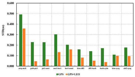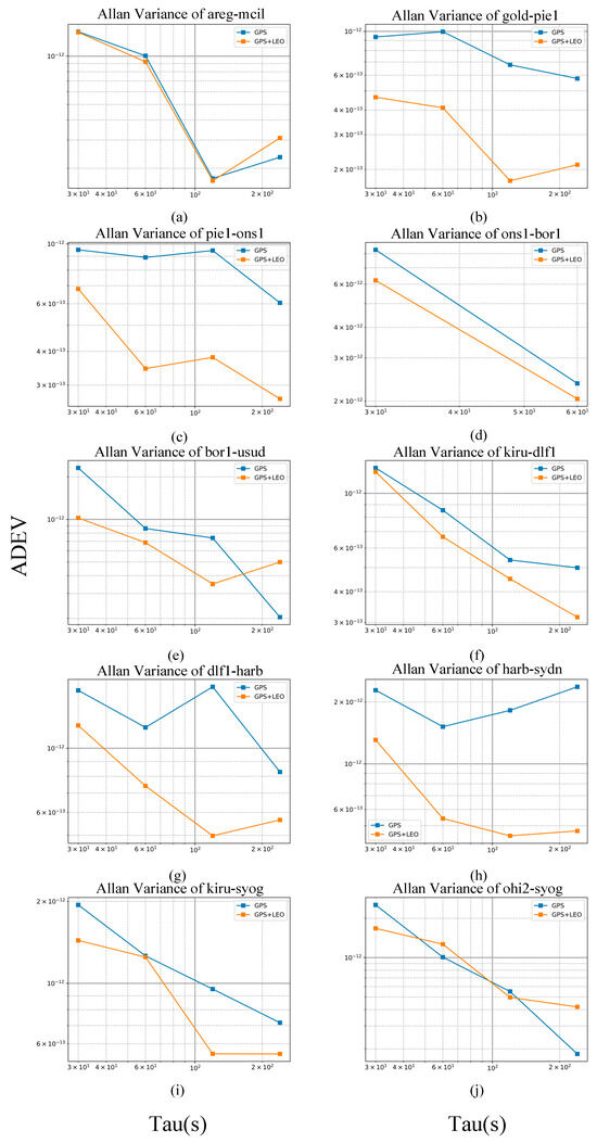 The time and frequency signals of the time transfer link are continuous. Time and frequency signals are not always fixed due to the influence of frequency source performance variation characteristics. However, this alteration has the same impact on the two data processing schemes [1], whether long-term or short-term. The Allan deviation is employed to assess the frequency stability of the time transfer clock offset sequence in the convergence time span. The Allan deviation results for each time transfer link are shown in Figure 10. The blue curve represents the Allan deviation obtained by the sole GPS time transfer scheme, and the orange curve represents the Allan deviation obtained by the GPS + LEO time transfer scheme. The Allan deviation obtained by the GPS + LEO time transfer scheme obviously shows a smaller variance. Thus, adding low-orbit satellites to the sole GPS data improves the frequency stability of the time transfer clock error sequence within the convergence time range. The Allan deviation results for the 10 links were calculated and averaged. As depicted in Table 7, the frequency stability was improved after LEO enhancement over different sampling time intervals, with a minimum improvement of 25.7%. Consequently, within the time transfer convergence interval, LEO-enhanced PPP time transfer can effectively improve the frequency stability of the time transfer link’s clock error sequence. The principal rationale is the fast geometry change in the low-orbit satellites, which allows for a faster and more stable estimation of the receivers’ position and clock offset.
