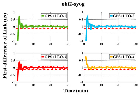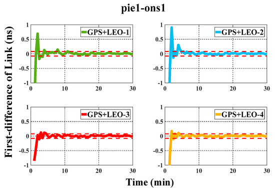The clock offset of a time transfer link calculated for the established 10 links are shown in Figure 5. The time transfer link clock offset had the same performance as the receiver clock offset. The time transfer link achieved using LEO-augmented PPP exhibited a faster performance compared to that attained by the GPS system (Figure 6). Concurrently, the 10 links had different latitude distributions, baseline lengths, and clock sources. Although the different time transfer links had different characteristics, they exhibited similar performances. A first-order differential calculation was applied to the clock offset sequence of the time transfer link, and the convergence confidence interval was determined. The results are presented in Figure 7. The first-order difference of the clock offset clearly showed faster convergence after LEO enhancement. The results of the convergence time calculations are presented in Table 5 and Figure 8.