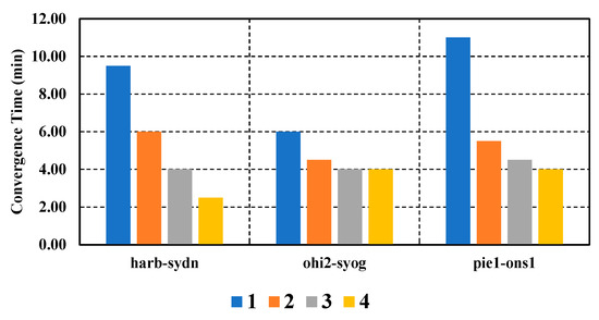 Convergence time statistics of the three links across the four enhancement scenarios (min).