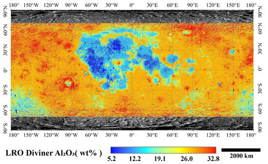 LRO Diviner Al2O3 map (70° N/S, 32 ppd [43]); the base image is LROC WAC map (100 m/pixel [62]).