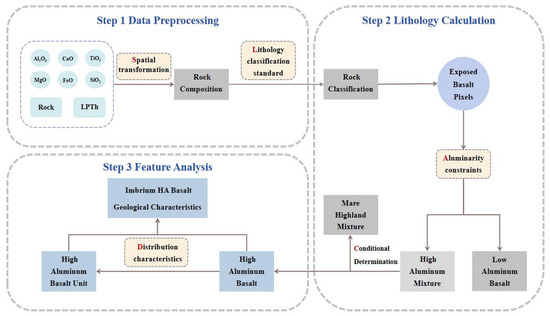 To solve the above problems and current challenges, this paper uses the five main oxide products (Al2O3, TiO2, FeO, CaO, and MgO [43]) estimated from the Lunar Reconnaissance Orbiter (LRO) Diviner CF product, combined with the LP-GRS Th data and following the laboratory lithology classification criteria [49], and established the lunar lithology classification image. According to the composition relationship of adjacent pixels, the interference of the mare–highland mixture is excluded, and the HA basalt pixels are identified. Their distribution and the map of HA basalt units formed by the early volcanic eruption of Mare Imbrium are provided. The morphological and geological characteristics of these units are calculated, and the patterns and eruption characteristics of early aluminiferous volcanic activity on the moon are analyzed.