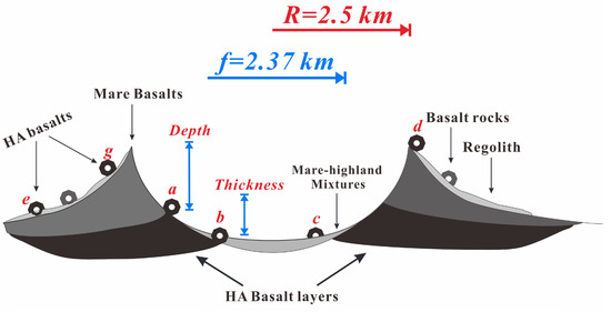 Notably, when calculating the buried depth and thickness of the HA basalt layer, different degrees of ejecta from the adjacent crater will affect the calculation. For example, from the vertical profile of the crater (Figure 4), when calculating the depth and thickness of HA basalts a and b on the crater wall as examples, the HA basalts at other locations represent the interference factors in the calculation. Among them, c represents the HA basalt that slips from the crater wall to the bottom, e represents the HA basalt in the distal ejecta, g represents the HA basalt in proximal ejecta on the edge of crater, and d at the top of the opposite side of a and b. They may irregularly distribute on both sides of the crater edge (d, e, g), wall (a, b), and bottom (c). This distribution may lead to inaccurate calculation of the maximum and minimum elevation difference of the pixels and may overestimate the depth and thickness of HA basalt layer. For example, the burial depth of pixel a should be calculated from the top of its side rather than the position of the top d on the other side. The thickness of the HA basalt layer depends on the depth of a and b, but not the depth of other pixels. To improve the accuracy of the morphological geological feature calculation, we introduce a distance threshold f to eliminate the influence of the distal ejecta e and then eliminate on the other side top d in the calculation. When observing craters in Imbrium, we noticed that most craters containing HA basalts have a radius R of no more than 2.5 km. Therefore, we use Formula (1) and set the threshold f to 10 (f is equal to 2.37 km, the distance of 10 pixels in the rock abundance image) to calculate the thickness and burial depth of the HA basalt layer. The i and j represent the latitude and longitude of the HA basalt pixel. The burial depth of an HA basalt pixel is equal to the maximum elevation of the adjacent 10 pixels minus the elevation of the pixel. The thickness is equal to the maximum burial depth of the adjacent 10 pixels minus the burial depth of the pixel. The maximum and minimum burial depths of the HA basalt unit are equal to the maximum and minimum burial depths of HA basalt pixels on the crater wall inside the unit, and the thickness of the unit is equal to the average thickness of the HA basalt layer inside the unit. In addition, this calculation process may be affected by several error sources: (1) The HA basalt may be broken, worn, and scoured when moving to the crater bottom, resulting in mass wasting. (2) The possible proximal ejecta adjacent to the crater may cause the HA basalt layer’s estimated thickness to be overestimated during the calculation. (3) Different crater forms may affect the internal rock layer due to geological factors such as collapse, fragmentation, and rock accumulation.