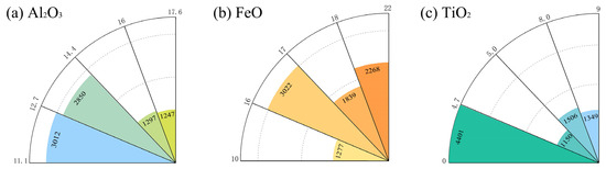 In addition, the regolith composition does not reflect the true composition of HA basalt units. The HA basalt pixels’ average oxide abundance in units should represent the entire unit composition. Therefore, the average compositions of HA basalt pixels were more representative of the whole unit. According to the location of exposed HA basalt pixels, combined with the Diviner main oxide image, their main oxide abundances (Al2O3, TiO2, and FeO) were calculated, and the unit average oxide abundance was calculated in combination with the area of units. At the same time, considering the influence of other special composition basalts (such as high-Ti basalt and low-Al basalt), the abundance of three oxides in non-HA basalt pixels were assigned the value of 0.