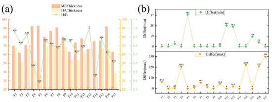 The young mare basalt (MB) magma (3.6~2.6 Ga, [31]) filled Mare Imbrium and overlaid the rock layers, possibly constituting the underlying unit of the HA basalts. The overlay of MB layers and special topography (such as fold ridges, ground uplift, and impact craters) cause the pixels identified in HA basalt units to be scattered rather than aggregated. These pixels have different burial depths. Therefore, the formed HA basalt layers were discontinuous and their thicknesses were not consistent. To understand the vertical distribution of HA basalt layers, the exposed MB pixel locations in 17 units and Formulas (1) and (2) were used to calculate their vertical distribution characteristics in vertical (thickness and maximum, minimum burial depths). Figure 9a shows the average thickness and proportion of HA basalts and MB. Figure 9b calculates the minimum burial depth difference and the maximum burial depth difference between two layers.
