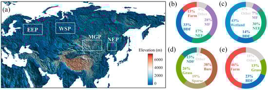 Study area. (a) is the elevation map of the four typical regions in Eurasia, (b–e) represent the percentage of different ecosystems of EEP, WSP, MGP, and NEP, respectively, where the gray color represents other ecosystems with less area, which are not considered in this study.
