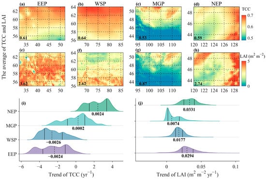 Spatial and temporal variation of TCC and LAI from 2001–2021 (JJA). Where (a–h) are the spatial distributions of the multi-year mean (JJA) of TCC and LAI, respectively, with black numbers representing the mean of the corresponding region. Columns 1–4 represent EEP, WSP, MGP, and NEP, respectively. (i,j) are ridge plots characterizing the trend distributions of TCC and LAI (JJA), respectively, where the black dashed lines and numbers represent the median of the trends and the black solid lines represent the 25% and 75% quantiles of the trend, respectively.
