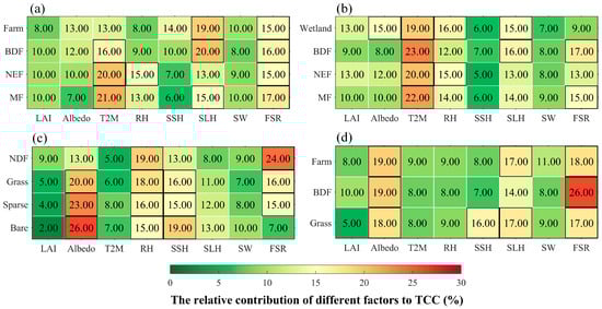 The averaged relative contribution of the leaf area index (LAI), surface albedo (Albedo), surface air temperature at 2 m (T2M), relative humidity (RH), surface sensible heat flux (SSH), surface latent heat flux (SLH), soil water content (SW), and forecast surface roughness (FSR) to total cloud cover (TCC), where (a–d) represent EEP, WSP, MGP, and NEP, respectively. The numbers represent the percentage of the relative contribution. Note that when the averaged relative contribution exceeds 15%, it is highlighted with a black outline.