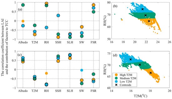 The contribution of each factor to the TCC is influenced by both vegetation and non-local variables (moisture and heat advection, atmospheric circulation). To investigate the moderating effect of vegetation on the factor contributions, it is necessary to control the influence of non-local variables. Based on k-means clustering, the pixels are clustered into three climate categories according to T2M and RH, as shown in Figure 4b,d. After clustering, the pixels within the same category have more similar climatic backgrounds, then the influence of non-local variables on factor contributions are approximated, and the differences in factor contributions among different pixels are mainly caused by vegetation. Then, the correlation analysis between vegetation and factor contributions can easily reveal the direction of vegetation regulation of factor contributions.