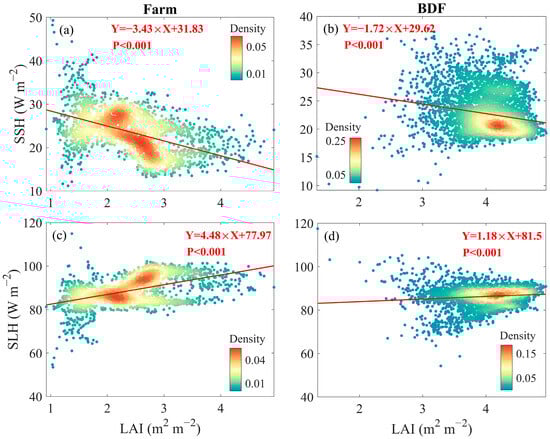 The changes in heat fluxes with LAI, where (a,b) are SSH of the farm and BDF ecosystems, while (c,d) are SLH.