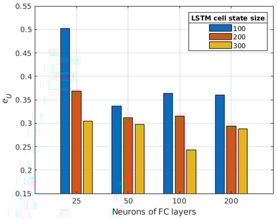 The neural network used to perform modeling error correction has been assessed versus some of the main hyperparameters, i.e., the LSTM cell state size (indicated in Section 2.1 as the variable ) and the number of neurons present in each fully connected (FC) layer (i.e., the variable ). In particular, the values and have been considered.