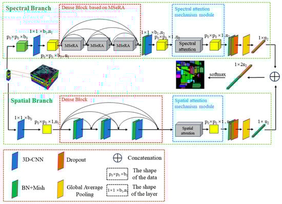 The overall structure of the DBMSDA network is shown in Figure 1. It consists of three main parts: the spectral branch, the spatial branch, and the classification head. The spectral branch is at the top of the model diagram, and the spatial branch is at the bottom. Finally, the two branches’ features are combined for classification. The spectral branch mainly consists of the MSeRA dense connection module and spectral attention module, while the spatial branch comprises the spatial dense connection module and spatial attention module. The overall framework adopts a “parallel form” double-branch structure, differing from the “series form” single-branch network framework used by FDSSC [] (where spectral information is first extracted, followed by spatial information). A single-branch network may cause spectral and spatial features of HSI data to be in different domains, potentially leading to the destruction of spatial features extracted later []. Since HSI data are stored as a three-dimensional cube, traditional 1D-CNN can only capture spectral information, while 2D-CNN can only capture spatial information to some extent []. Neither can effectively extract both spectral and spatial information simultaneously. However, 3D-CNN can extract both types of information concurrently, providing clear advantages in processing three-dimensional structural data like HSI. Therefore, this article uses 3D-CNN as the fundamental convolutional structure of the DBMSDA network to extract HSI features. The network input size is . To prevent data explosion and gradient disappearance, BN + Mish [] is used to standardize the results after each convolution in dense connections. To extract as many useful features as possible, a self-attention mechanism is added after dense connections to emphasize important features. Then, the dropout layer and global average pooling layer are used to convert the cubic feature maps from the two branches into one-dimensional vector features. Finally, the two one-dimensional vector features are combined, and the linear layer is used for classification.