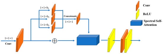 Based on the concepts of multi-scale and attention, this article introduces a multi-scale residual self-attention (MSeRA) structure, as illustrated in Figure 2. The MSeRA structure is a branching structure containing three convolution kernels of different sizes. This article uses a 1 × 1 × 1 convolutional layer as the initial component of the MSeRA structure to increase the input size. Then, a multi-scale convolution group is used for feature extraction. A convolutional group with three convolution kernels of different sizes (1 × 1 × b, where b1 = 3, b2 = 5, b3 = 7) is selected to construct feature representations at different scales. By utilizing multi-scale spectral dense blocks, the network can capture various levels of spectral features aligned with multiple receptive fields in each channel. This approach enables the network to gather more comprehensive spectral information, enhancing classification performance. The different output feature maps obtained at the three scales are then combined to obtain the fused feature. To address the issue of vanishing network gradients, this article uses skip connections to generate residual maps. This connection links the initial input features with the fused features to prevent gradient vanishing and information loss, enhancing the network’s expressive power. The spectral self-attention mechanism is then utilized to highlight valuable multi-scale spectral information and mitigate the impact of redundant data. The spectral self-attention mechanism here is consistent with the spectral attention block in Section 3.4.1 of the Spectral Attention Module. Finally, all feature maps are passed through a 1 × 1 × 1 convolutional layer to ensure consistent dimensions. The MSeRA structure can effectively extract spectral information from hyperspectral images, which contain rich features at various scales. It can also learn adequate and diagnostic spectral features from a small number of samples, enabling the network to achieve good results even with limited training samples.