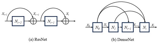 Dense connections differ from residual connections []. Residual connections can be viewed as a mapping that allows input data to pass directly through the network [], as illustrated in Figure 3a. Dense connections, proposed based on residual connections, directly link each layer to ensure a maximum information exchange between network layers, as illustrated in Figure 3b. The denser the connections, the more information flows through them. Specifically, a dense connection with N layers has N(N + 1)/2 connections, while a traditional convolutional network with the same number of layers has only N direct connections [].