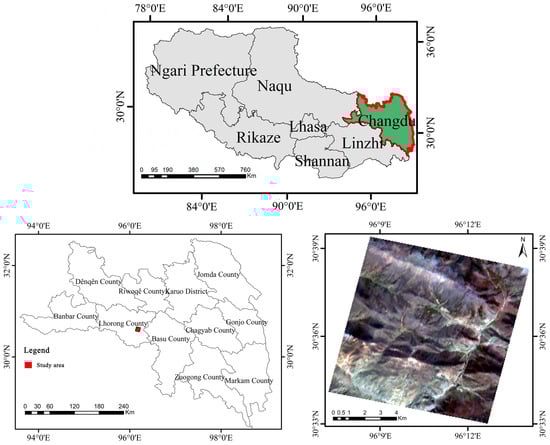 - KY dataset: This hyperspectral lithology dataset was created using ENVI 5.3 software, MATLAB R2021b software, manual interpretation, and field surveys with data from the Zhiyuan-1 remote sensing satellite. The data were collected in the eastern part of Luolong County, Changdu City, Tibet Autonomous Region, China (Figure 5). The image has a spatial resolution of 30 m. The original remote sensing image covers an area of 147 square kilometers, situated between latitudes 30°33′–30°40′N and longitudes 96°07′–96°14′E. The terrain is predominantly bare mountains. The image has spatial dimensions of 300 × 300 and consists of 166 bands. Excluding background pixels, the number of spatial pixels used for the experiment is 89,981. There are six types of real ground objects, mainly consisting of various surface lithologies such as sand and gravel, mudstone, sandstone, quartz sandstone, slate, schist, and phyllite. These represent different surface outcrop lithologies, with detailed information provided in Figure 6. There is a clear imbalance in the number of samples from different categories. The average training pixels account for 4.5% of the labeled pixels.