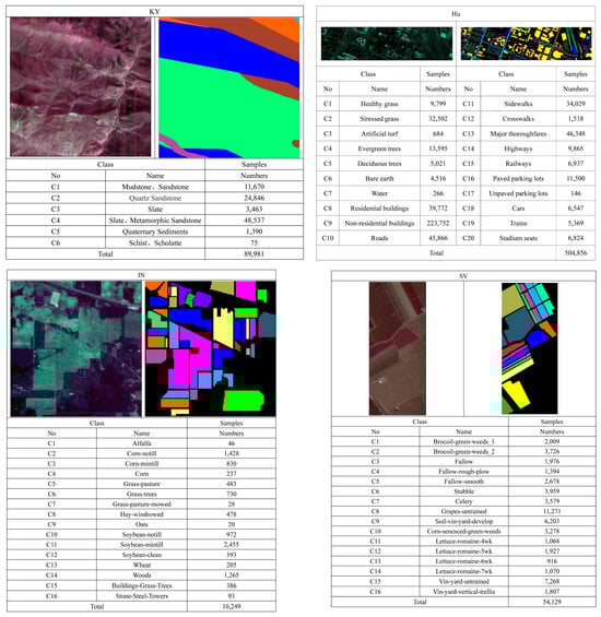 To validate the effectiveness of our proposed method and enable fair comparison with existing approaches, we conducted performance evaluations on a self-constructed lithology dataset and three widely recognized public datasets: KY, Houston_2018 (Hu), Indian Pines (IN), and Salinas Valley (SV). These datasets are outlined as follows: